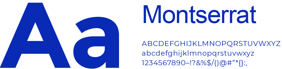 A Montserrat foi escolhida pela sua variedade de pesos e versatilidade, tanto no ambiente digital quanto no impresso. Todos os pesos podem ser usados em textos de apoio, subtítulos, destaques de informações.